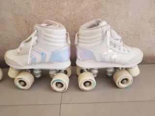 Se venden patines artísticos de 4 ruedas Rookie, ideales para iniciarse en el patinaje. Incluyen protecciones sin estrenar - Patines blancos con cordones arcoíris. - Ruedas rojas. - Incluye juego de protecciones.