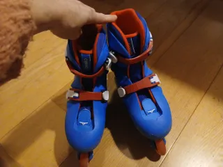 Patines en línea Oxelo en color azul y rojo, ajustables en talla. - Talla 30-32. - Cierre con hebilla y velcro. - Ruedas de patinaje en línea. -Protecciones talla XS, codos,manos y rodillas -Casco.