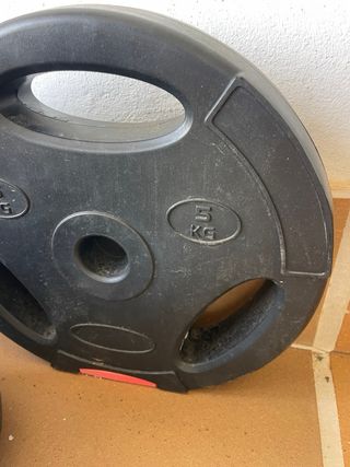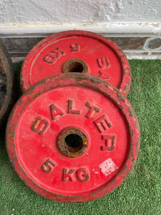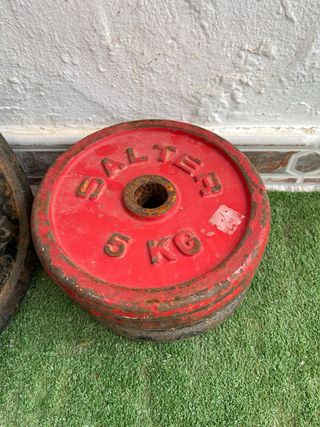 Pesas 4 de 10 k 6 de 4 k 5 de 5 k Mas barra de pres de banca 8 k Mas algunas mas de 2,5 k de regalo.