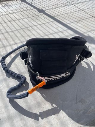 Arnés de kitesurf en color negro y gris. - Hebillas y enganches metálicos. - Correa ajustable. - Acolchado en la zona lumbar y de las piernas.