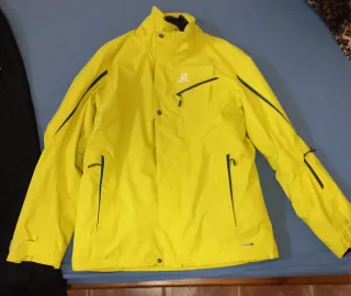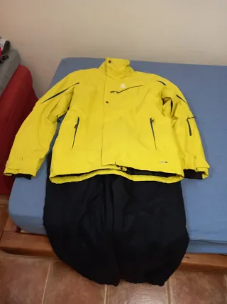 Chaqueta técnica Salomon en color amarillo, talla L. ideal para actividades de nieve como esquí o snowboard. Diseño moderno y funcional. Pantalón Brugui color negro con peto Talla L - Cremalleras y detalles en azul marino. - Bolsillos frontales con cremallera. - Bolsillo en manga. - Cuello alto. - Gorro desmontable