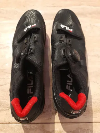 Zapatos de spinning Fila en talla 43, prácticamente nuevos. - Cierre de dial. - Diseño deportivo. - Color negro con detalles rojos.