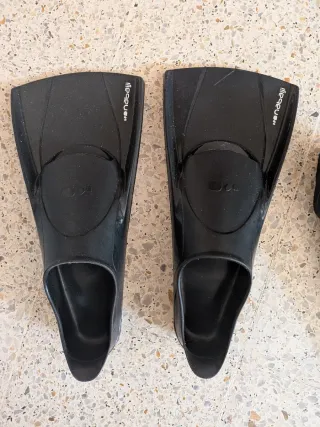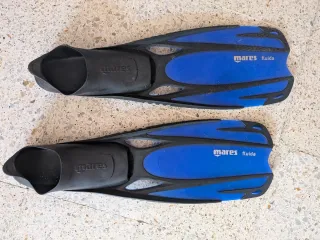 Se venden dos pares de aletas. Unos son de la marca Mares Fluida en color azul talla 38-39 y las otras del decathlon talla 37-38. Los dos pares por 20 euros