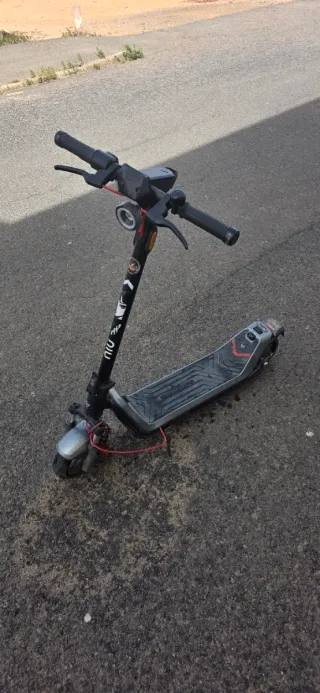 Patinete eléctrico NIU KQi300X en color negro y detalles rojos. Ideal para desplazamientos urbanos. - Diseño moderno y deportivo. - Ruedas de 9.5 pulgadas. - Frenos de disco delanteros y traseros. - Potente motor para mayor rendimiento. Tiene las ruedas sin aire habría que arreglarlo no creo que cueste mucho tiene una pegatina de una tienda para arreglarla y el freno de atrás que se rompió pero a mi me funciona igual asi