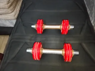 Par de mancuernas con discos de peso en color rojo. - Barras metálicas. - Discos de peso rojos. Son dos unidades de 4kgrs cada una.el precio es por las dos,no se envía solo recogida en Fuerteventura (Puerto del Rosario).Precio no negociable.
