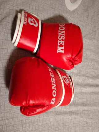 Par de guantes de boxeo de color rojo, marca BONSEM. - Cierre de velcro. - Diseño acolchado.
