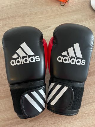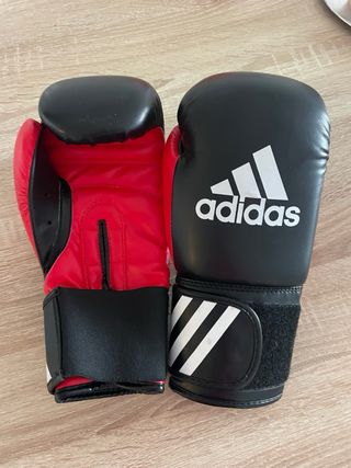 Par de guantes de boxeo de la marca Adidas, en color negro con detalles rojos. Perfectos para entrenamientos. - Cierre de velcro. - Diseño con las tres rayas características de Adidas.