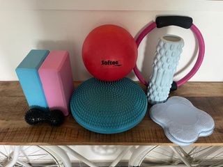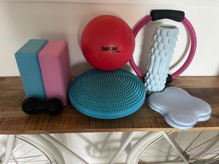 Pack de material para Pilates, con muy poco uso. - Incluye dos bloques de yoga (uno azul y otro rosa). - Pelota de Pilates roja. - Disco de equilibrio verde. - Rodillo de espuma azul. - Aro de Pilates rosa. - Rueda de masaje negra. - Almohadilla de equilibrio azul con diseño.