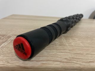 Rodillo de masaje de la marca Adidas, ideal para recuperación muscular. - Diseño ergonómico con textura. - Empuñaduras negras con detalles de Adidas. - Tapa roja con logo de Adidas.