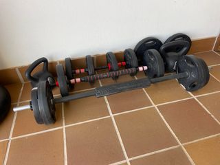 Equipo de gimnasio para entrenar en casa. - Barra de pesas con agarre acolchado. - Mancuernas con discos. - Mancuernas rusas (kettlebells). - 6 discos de 5 kgs y 6 de 2,5 kgs.