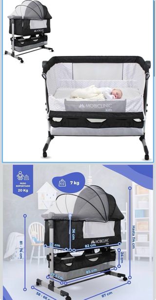 Cuna de colecho Mobiclinic en color negro y gris, con dosel. - Peso soportado: 20 Kg - Peso del producto: 7 kg - Medidas: 81-76 cm (alto), 53 cm (ancho), 82 cm (largo), 24 cm (profundidad), 27.5 cm (base), 85 cm (base largo), 87 cm (base ancho), 36 cm (altura interior), 114 cm (altura máxima). - Incluye cestas de almacenamiento.