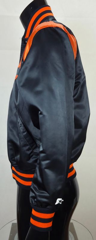 Chaqueta tipo bomber del equipo de baseball de la MLB Orioles. De la marca Starter. En talla L de joven americana. Es una talla amplia, ver las medidas, equivale a una M europea. Chaqueta de los años 80. En excelente estado de conservación. Como nueva. Medidas: Hombros: 50 cm Axila a Axila: 63 cm Largo: 60 cm
