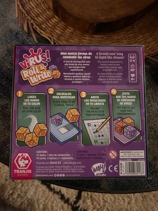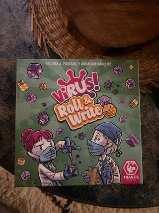 Juego de mesa Virus! Roll & Write. - Juego de mesa de Paloma J. Pascual y Abraham Sánchez. - Incluye dados y componentes para jugar. - Diseño temático de virus y científicos.
