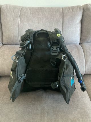 Chaleco de buceo de la marca Aqualung, talla XS - Color negro. Tiene muchas inmersiones, pero funciona a la perfección. Tanto las válvulas y la tráquea funcionan. La tela tiene algún daño què está indicado en la foto pero compromete su funcionamiento.