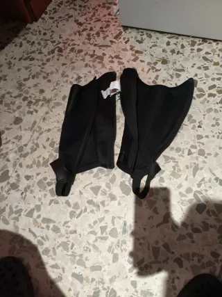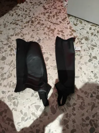 Polainas de equitación negras, diseñadas para proteger las piernas durante la monta. - Material exterior de cuero sintético. - Paneles laterales elásticos para un mejor ajuste. - Cierre de cremallera. - Correa inferior para el zapato. - Talla L