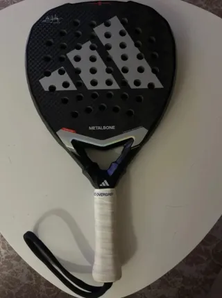 Pala de pádel Adidas Metalbone, modelo Alex Galán. - Diseño en negro con detalles plateados. - Logo de Adidas en la cara. - Firma de Alex Galán. - Nombre METALBONE visible. - Overgrip blanco.
