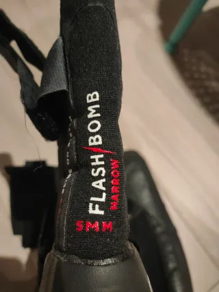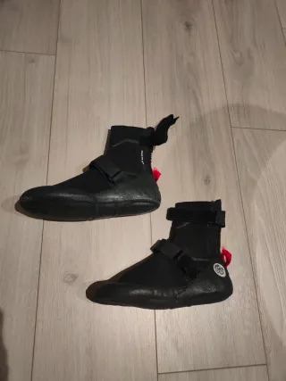 Escarpines de neopreno Rip Curl Flash Bomb. Son super calientes para el invierno. Están prácticamente nuevos,el crío los uso dos veces y se le han quedado pequeños. - Talla 7. - Color negro. - Cierre de velcro. - Tirador trasero para facilitar su colocación.
