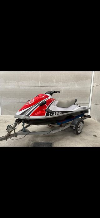 Moto de agua Yamaha con un diseño deportivo en rojo, negro y blanco. - Logo de Yamaha en la parte frontal. - Espejos laterales negros. - Incluye remolque. - tres plazas - 250 horas de navegacion - documentacion al dia - puesta a punto al dia