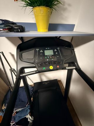Cinta de correr Decathlon T900D en color negro. - Diseño plegable para facilitar su almacenamiento. - Pantalla digital con información de entrenamiento. - Empuñaduras ergonómicas.