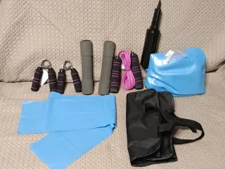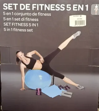 Set de fitness 5 en 1 que incluye varios accesorios para tu entrenamiento. - 1 Pelota de fitness 55 cm. - 1 Banda elástica 120 cm. - 1 Cuerda para saltar 275 cm. - 1 par de empuñaduras para ejercicios de mano. - 1 par de mancuernas de 1 kg.