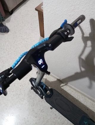Patinete eléctrico con diseño moderno y manillar ergonómico. - Pantalla digital integrada. - Puños con agarre. - Cableado protegido con funda azul.