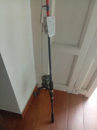 Se vende caña de pescar completa con carrete. - Caña de pescar de color gris y rojo. - Carrete de pesca plateado.