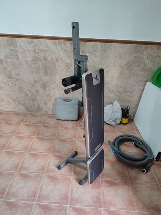Equipo de gimnasio para entrenar en casa. - 85kg - Estructura metálica resistente. - Asiento y respaldo acolchados en color azul. - Barras y agarres para diversos ejercicios.