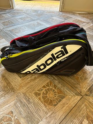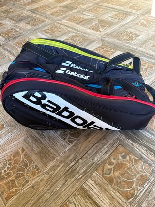 Bolso de pádel de la marca Babolat. - Color negro con detalles en amarillo y rojo. - Diseño moderno y espacioso. - Logo de Babolat visible. Algo negociable..