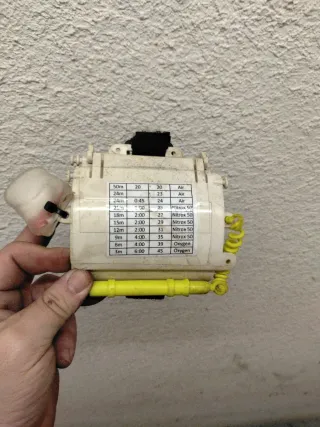 Pizarra de buceo con tabla de profundidades y mezclas de gases. - Tabla de profundidades para aire, Nitrox 50 y Oxígeno. - Profundidades de 3m a 50m. - Tiempos de fondo indicados.
