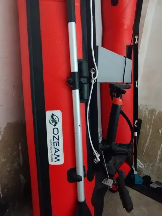 Se vende bote de pesca marca Ozeam junto con un motor Suzuki. - Bote inflable de color rojo. - Incluye remos y asiento.