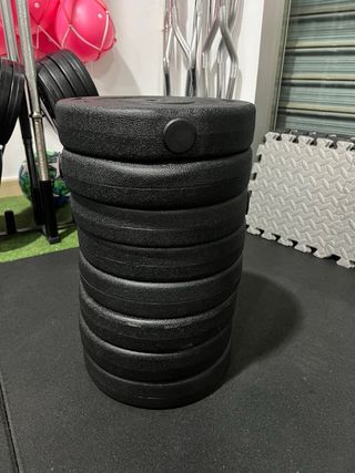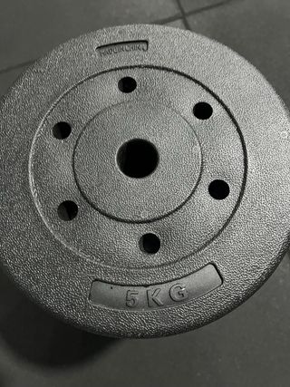 Discos de gimnasio para pesas. - 8 discos de 5 kg con agujero de 3 cm - 14 discos de 2,5 kg con agujero de 3 cm - Fabricados en China. -se venden todos juntos no por separado