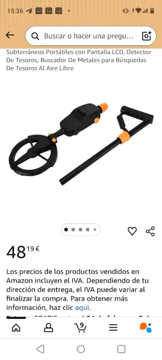 Detector de metales en su embalaje original. - Color negro y naranja. - Incluye base circular.