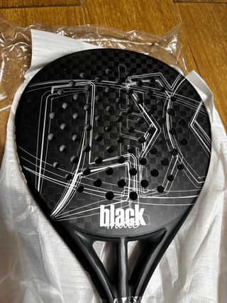 Pala de pádel de alta gama con un diseño moderno y llamativo. - Acabado en carbono. - Diseño con líneas blancas sobre fondo negro.