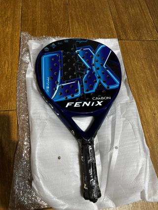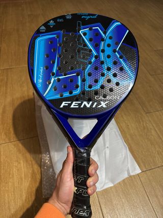 Pala de pádel Fenix de alta gama. - Diseño con detalles en azul y negro. - Superficie con acabado mate. - Marco de carbono.