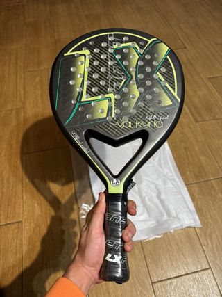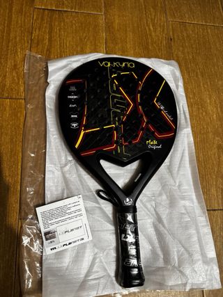 Pala de pádel de alta gama con diseño llamativo. - Marco negro con detalles en amarillo y rojo. - Superficie con agujeros. - Logo Valkyria en la parte superior. - Modelo Original visible en la cara. - Grip negro con logo LX. - Material Eva indicado.