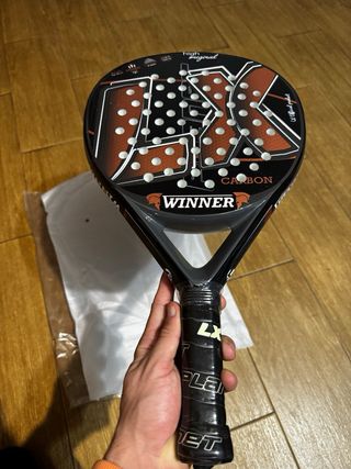 Pala de pádel Winner de alta gama, con un diseño moderno y llamativo. - Pala de pádel Winner. - Diseño de alta gama. - Acabado en carbono.