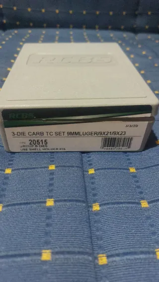 Set de 3 troqueles RCBS para calibre 9mm Luger. - Modelo: 3-Die Carb TC Set. - Calibres compatibles: 9mm Luger, 9x21, 9x23. - Número de pieza: 20515. - Grupo: B Dies. - Requiere Shell Holder #16.
