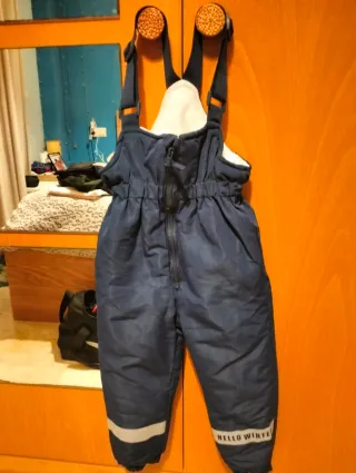 Pantalón de nieve azul marino para niño, ideal para mantener el calor en invierno. Cuenta con tirantes ajustables y un práctico cierre de cremallera. - Tirantes ajustables. - Cierre de cremallera frontal. - Detalle reflectante en los bajos. - Talla 98 cm pero es grande mi hijo de 4 años y medio le sirve