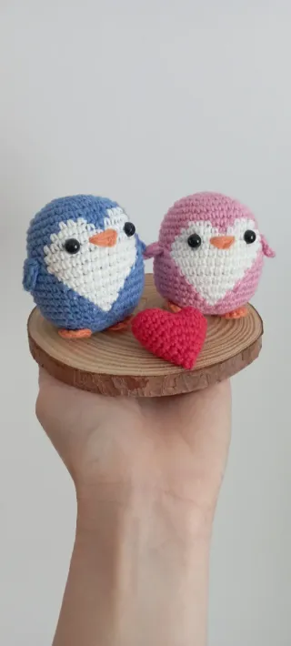 Adorable pareja de pingüinos hechos a mano con ganchillo, acompañados de un corazón. - Pingüino azul y blanco. - Pingüino rosa y blanco. - Corazón rojo. - Base de madera.
