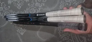 Dos raquetas de pádel, una de la marca middlemoon y otra Bullpadel. Las raquetas tienen algunos arañazos como sé observa en las fotos no tiene ningún golpe le tiene que cambiar el overgrip estan en mal estado y también por higiene