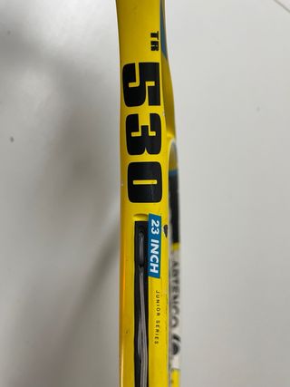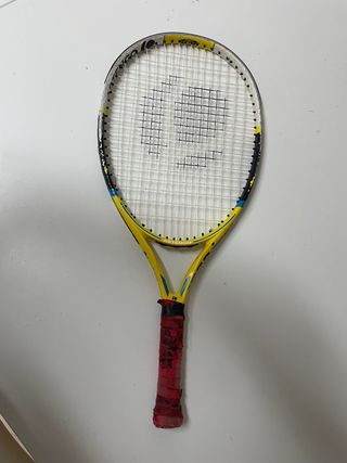 Raqueta de tenis para niños de 23 pulgadas, marca ARTENGO. Ideal para iniciarse en el deporte. Usada y con marcas de desgaste en la parte frontal como se ve en las fotos. - Color amarillo y azul. - Empuñadura roja. - Cuerdas negras.