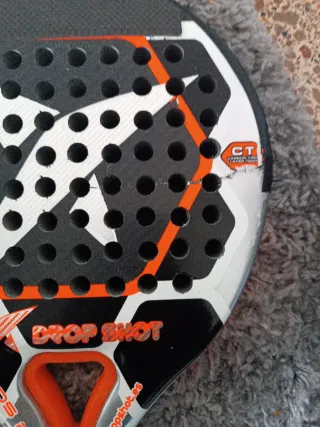 Raqueta de pádel Drop Shot con un diseño moderno y llamativo. - Superficie con agujeros para un mejor control. - Mango con grip para un agarre firme. - Incluye correa de seguridad. tiene algunos desperfectos visibles en las fotos