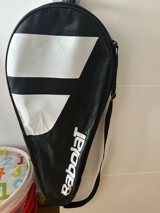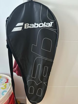 Funda para raqueta de tenis de la marca Babolat. Es de color negro con el logo blanco. - Cierre de cremallera. - Correa ajustable. Tiene una pequeña marca de estar doblada como se ve en la foto pero esta perfecta.