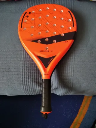 Raqueta de pádel Kuikma 120 en color naranja. - Diseño moderno con detalles en negro. - Superficie con agujeros. - Mango con grip negro. - Fabricada en Francia.Usada una vez y guardada.