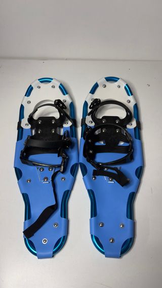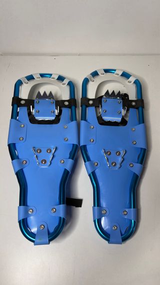 Raquetas de nieve en color azul y blanco, diseñadas para caminar sobre la nieve. - Marco de aluminio resistente. - Fijaciones ajustables para diferentes tallas de calzado. - Cubierta de plástico duradero.