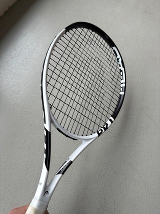 Raqueta de tenis Head Pro. - Marco blanco y negro. - Cuerdas negras. - Grip blanco.