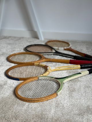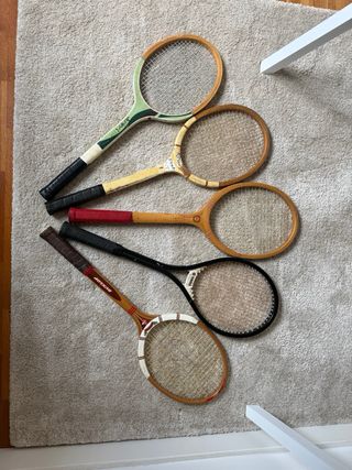 Conjunto de cinco raquetas de tenis clásicas, ideales para coleccionistas o para revivir el espíritu del tenis de antaño. - Fabricadas en madera (la negra en fiberglass) - Diseños vintage. - Perfectas para decoración temática.