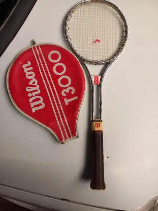 Raqueta de tenis Wilson T3000 con funda. - Raqueta de tenis vintage. - Funda protectora roja con logo Wilson T3000.
