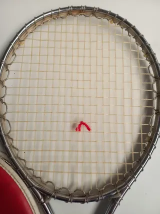 Raqueta de tenis vintage en un estado de conservación bueno. - Marco de metal plateado. - Grip azul con textura. - Cuerdas de malla fina.