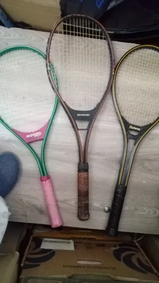 Lote de raquetas de tenis de varios colores. - Raquetas de diferentes colores: azul, rosa, verde y blanco. - Mangos de diferentes texturas y colores. No envíos . Pago en mano . Soy de jerez de la frontera . Precio unidad 3 .